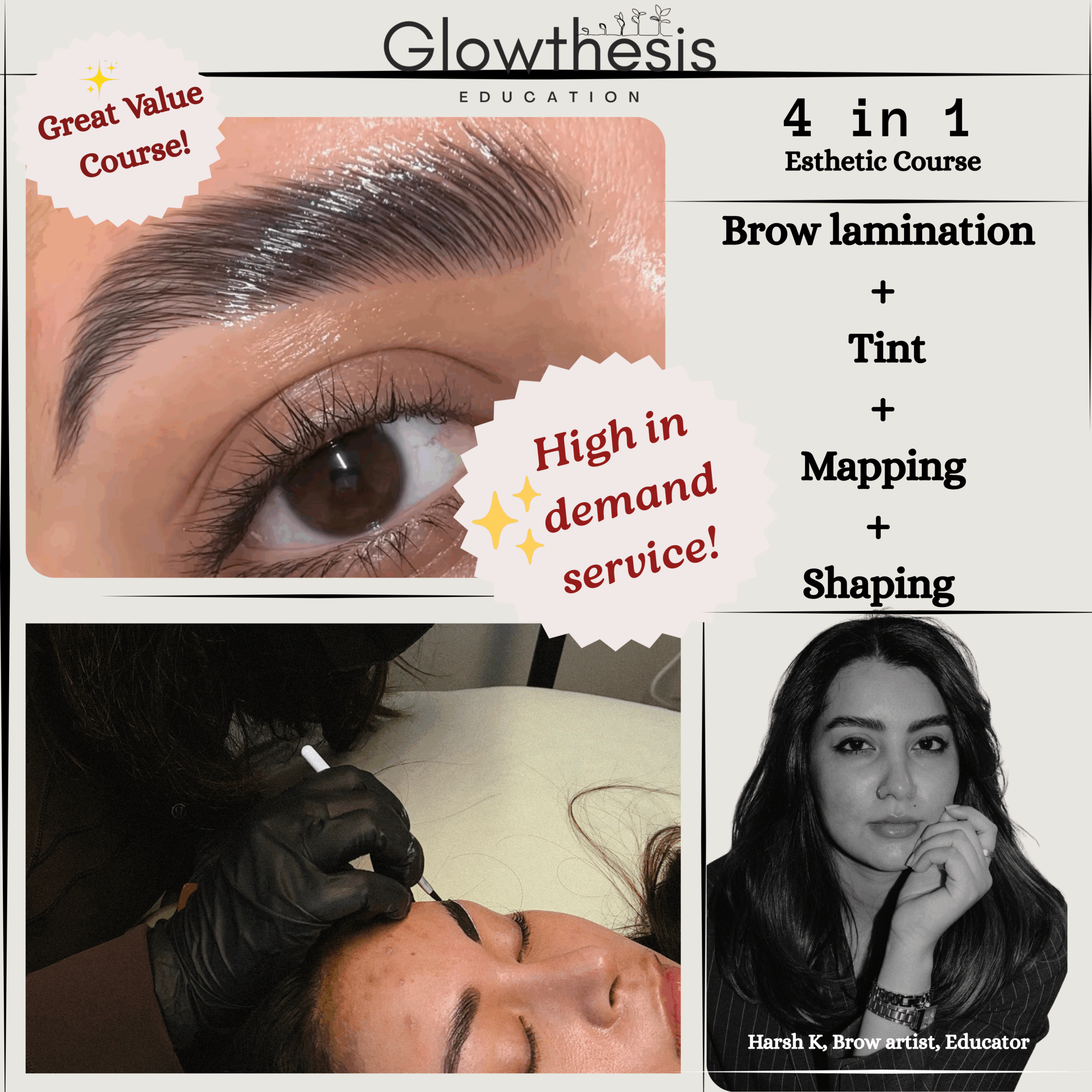 What is brow lamination, Benefits for different brow types, Differences from other brow treatments, What is tinting, Types of tint products, Combining tinting with lamination, Safety & Hygiene, Sanitization standards, Contraindications, Patch testing protocols, Client consultation & consent forms, Understanding solutions, Timing charts by hair type, Color theory and tint selection, Mixing ratios, Brow mapping and customizing shape & color, Measuring techniques, Tools, Mapping before tinting or laminating, Client style preferences , AHS requirements & more..